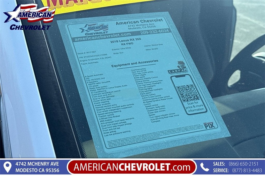 White 2018 Lexus RX 350 FWD 8-Speed Automatic 3.5L V6 DOHC 24V RX 350, 4D Sport Utility, 3.5L V6 DOHC 24V, 8-Speed Automatic, FWD, White, Stratus Gray, ABS brakes, Active Cruise Control, Alloy wheels, Compass, Electronic Stability Control, Front dual zone A/C, Heated door mirrors, Illuminated entry, Low tire pressure warning, Power Liftgate, Remote keyless entry, Traction control.