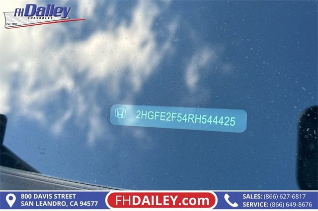 This vehicle is equipped with: 4-Wheel Disc Brakes, 8 Speakers, ABS brakes, Adaptive Cruise Control: Adaptive Cruise Control (ACC) with Low-Speed Follow, Air Conditioning, Alloy wheels, AM/FM radio, Apple CarPlay/Android Auto, Auto High-beam Headlights, Automatic temperature control, Brake assist, Bumpers: body-color, Cloth/Leatherette Seating Surfaces, Delay-off headlights, Driver door bin, Driver vanity mirror, Dual front impact airbags, Dual front side impact airbags, Electronic Stability Control, Emergency communication system: HondaLink, Exterior Parking Camera Rear, Four wheel independent suspension, Front anti-roll bar, Front Bucket Seats, Front Center Armrest, Front reading lights, Fully automatic headlights, Illuminated entry, Knee airbag, Leather Shift Knob, Leather steering wheel, Low tire pressure warning, Occupant sensing airbag, Outside temperature display, Overhead airbag, Panic alarm, Passenger door bin, Passenger vanity mirror, Power door mirrors, Power steering, Power windows, Radio data system, Radio: 180-Watt Audio System, Rear anti-roll bar, Rear side impact airbag, Rear window defroster, Remote keyless entry, Security system, Speed control, Speed-sensing steering, Steering wheel mounted audio controls, Tachometer, Telescoping steering wheel, Tilt steering wheel, Traction control, Trip computer, and Wheels: 18 Gloss Black Alloy Family Owned and Operated for Since 1910 FH Dailey Chevrolet has been serving San Leandro and the San Francisco, Oakland Bay Area since 1910. We work hard so you don't have too.