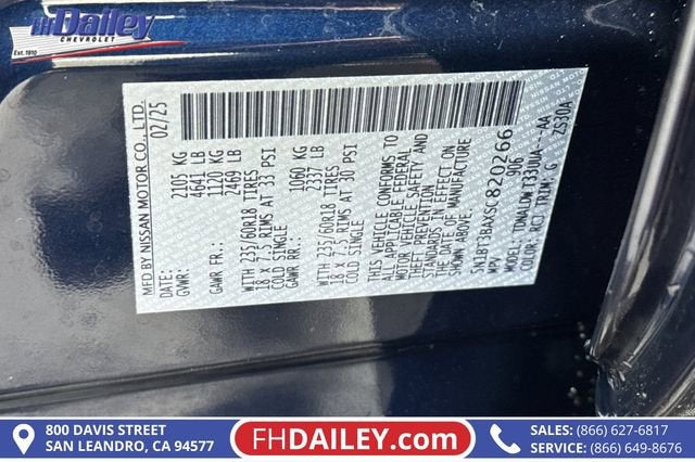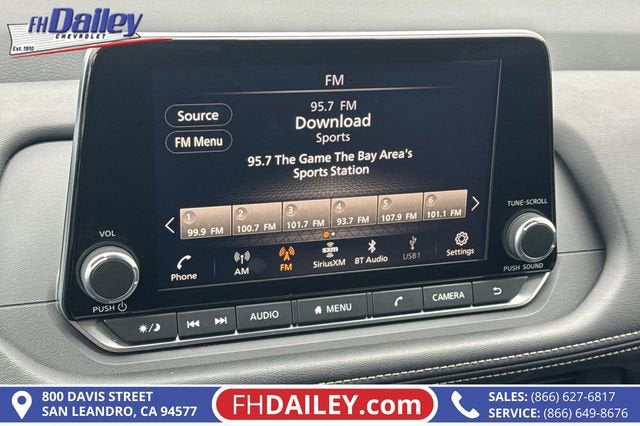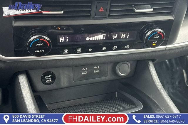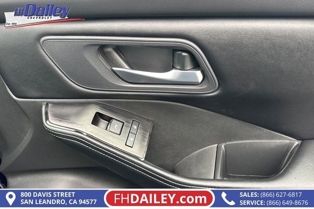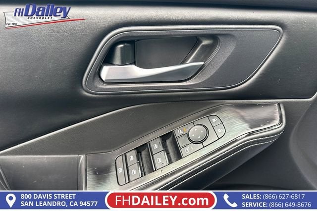 This vehicle is equipped with: 4-Wheel Disc Brakes, 6 Speakers, ABS brakes, Air Conditioning, Alloy wheels, AM/FM radio: SiriusXM, Android Auto and Apple CarPlay, Auto High-beam Headlights, Automatic temperature control, Brake assist, Bumpers: body-color, Cloth Seat Trim with Patterned Inserts, Delay-off headlights, Driver door bin, Driver vanity mirror, Dual front impact airbags, Dual front side impact airbags, Electronic Stability Control, Emergency communication system: NissanConnect Services, Four wheel independent suspension, Front anti-roll bar, Front Bucket Seats, Front Bucket Seats with 8-Way Power Driver Seat, Front Center Armrest, Front dual zone A/C, Front reading lights, Fully automatic headlights, Heated door mirrors, Illuminated entry, Knee airbag, Low tire pressure warning, Occupant sensing airbag, Outside temperature display, Overhead airbag, Overhead console, Panic alarm, Passenger door bin, Passenger vanity mirror, Power door mirrors, Power driver seat, Power Liftgate, Power steering, Power windows, Radio data system, Radio: NissanConnect with 6 Speakers, Rear anti-roll bar, Rear seat center armrest, Rear side impact airbag, Rear window defroster, Rear window wiper, Remote keyless entry, Speed control, Speed-sensing steering, Speed-Sensitive Wipers, Split folding rear seat, Spoiler, Steering wheel mounted audio controls, Tachometer, Telescoping steering wheel, Tilt steering wheel, Traction control, Trip computer, Variably intermittent wipers, and Wheels: 18 Dark Painted Machine Finished Alloy Family Owned and Operated for Since 1910 FH Dailey Chevrolet has been serving San Leandro and the San Francisco, Oakland Bay Area since 1910. We work hard so you don't have too.