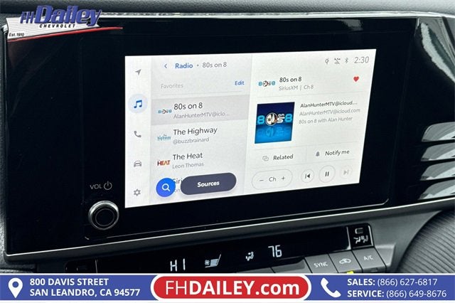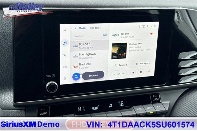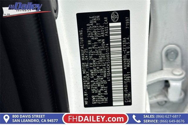 This vehicle is equipped with: 2.5L 4-Cylinder 16V DOHC, Black Cloth, 4-Wheel Disc Brakes, 6 Speakers, ABS brakes, Air Conditioning, All Weather Floor Protection (TMS), Alloy wheels, AM/FM radio: SiriusXM, Apple CarPlay/Android Auto, Auto High-beam Headlights, Automatic temperature control, Brake assist, Bumpers: body-color, Delay-off headlights, Driver door bin, Driver vanity mirror, Dual front impact airbags, Dual front side impact airbags, Electronic Stability Control, Emergency communication system: Safety Connect (up to 10-year trial subscription), Exterior Parking Camera Rear, Four wheel independent suspension, Front anti-roll bar, Front Bucket Seats, Front Center Armrest, Front dual zone A/C, Front reading lights, Fully automatic headlights, Heated door mirrors, Illuminated entry, Knee airbag, Leather Shift Knob, Leather steering wheel, Low tire pressure warning, Occupant sensing airbag, Outside temperature display, Overhead airbag, Overhead console, Panic alarm, Passenger door bin, Passenger vanity mirror, Power door mirrors, Power driver seat, Power steering, Power windows, Radio data system, Radio: Toyota Audio Multimedia w/12.3 Touchscreen, Radio: Toyota Audio Multimedia w/8 Touchscreen, Rear anti-roll bar, Rear reading lights, Rear seat center armrest, Rear side impact airbag, Rear window defroster, Remote keyless entry, Security system, SofTex & Fabric Seat Trim, Speed control, Speed-sensing steering, Split folding rear seat, Spoiler, Steering wheel mounted audio controls, Telescoping steering wheel, Tilt steering wheel, Traction control, Trip computer, Turn signal indicator mirrors, Variably intermittent wipers, and Wheels: 18 Black-Finished Alloy Family Owned and Operated for Since 1910 FH Dailey Chevrolet has been serving San Leandro and the San Francisco, Oakland Bay Area since 1910. We work hard so you don't have too.